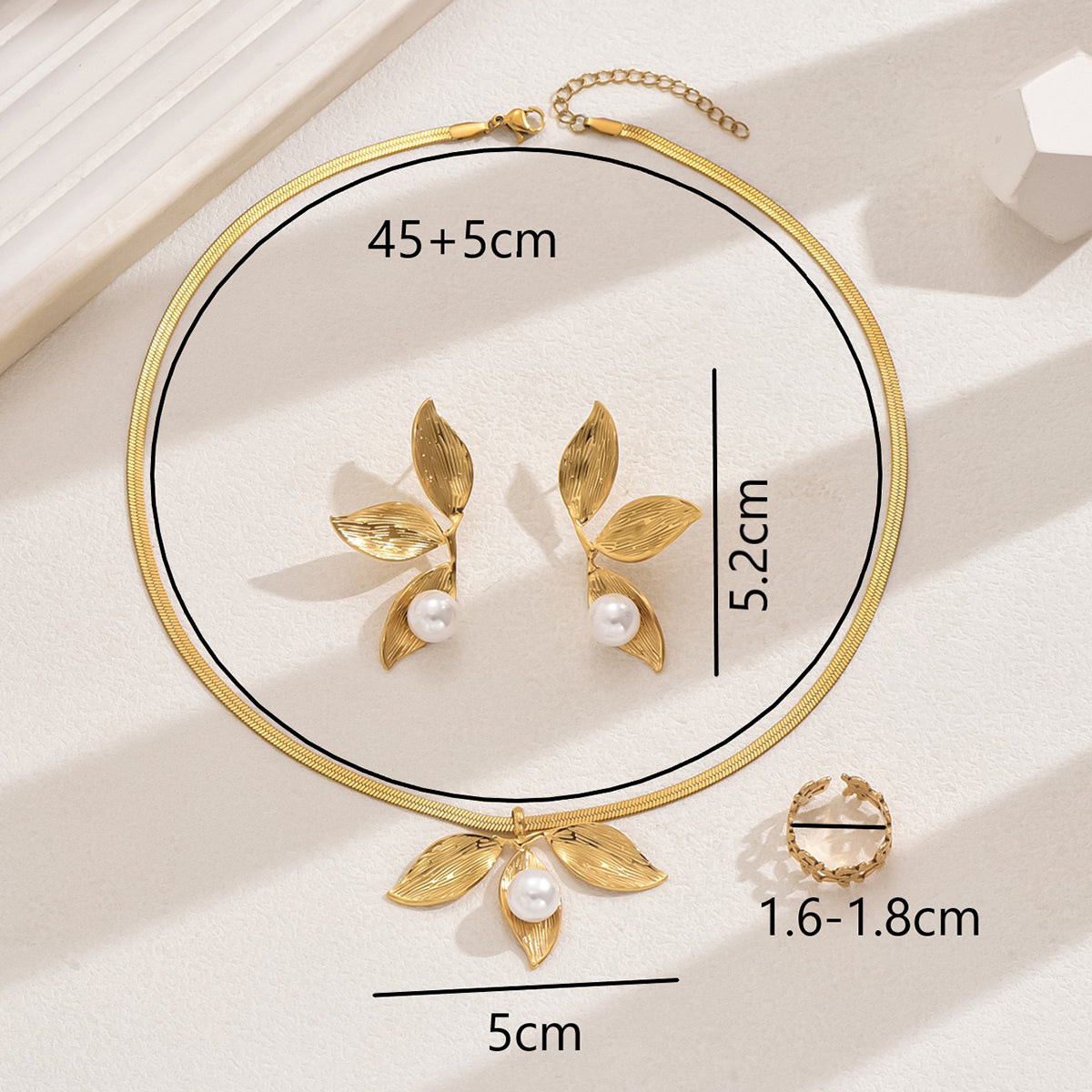 Enhance your style with the Golden Grove collection. This stunning three-piece 14k gold-plated set combines modern sophistication with the timeless beauty of nature. The 17" necklace features a delicate leaf pendant adorned with elegant pearls and a sleek, flat snake chain with a perfect drape. Matching earrings and a beautifully textured open ring complete a look as unique as you are.
