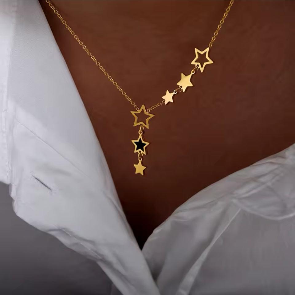 Minimalist gold necklace "Line of Stars" is a dazzling piece that brings elegance and sparkle to any look. Its sophisticated design features delicate stars that sparkle beautifully and create a hypnotic effect. This necklace is the perfect accessory to add a touch of glamour, whether you're dressing up for a special occasion or to enhance an everyday outfit. Its timeless appeal makes it a must-have addition to any jewelry collection, as it captures both the magic of starlight and the elegance of gold.